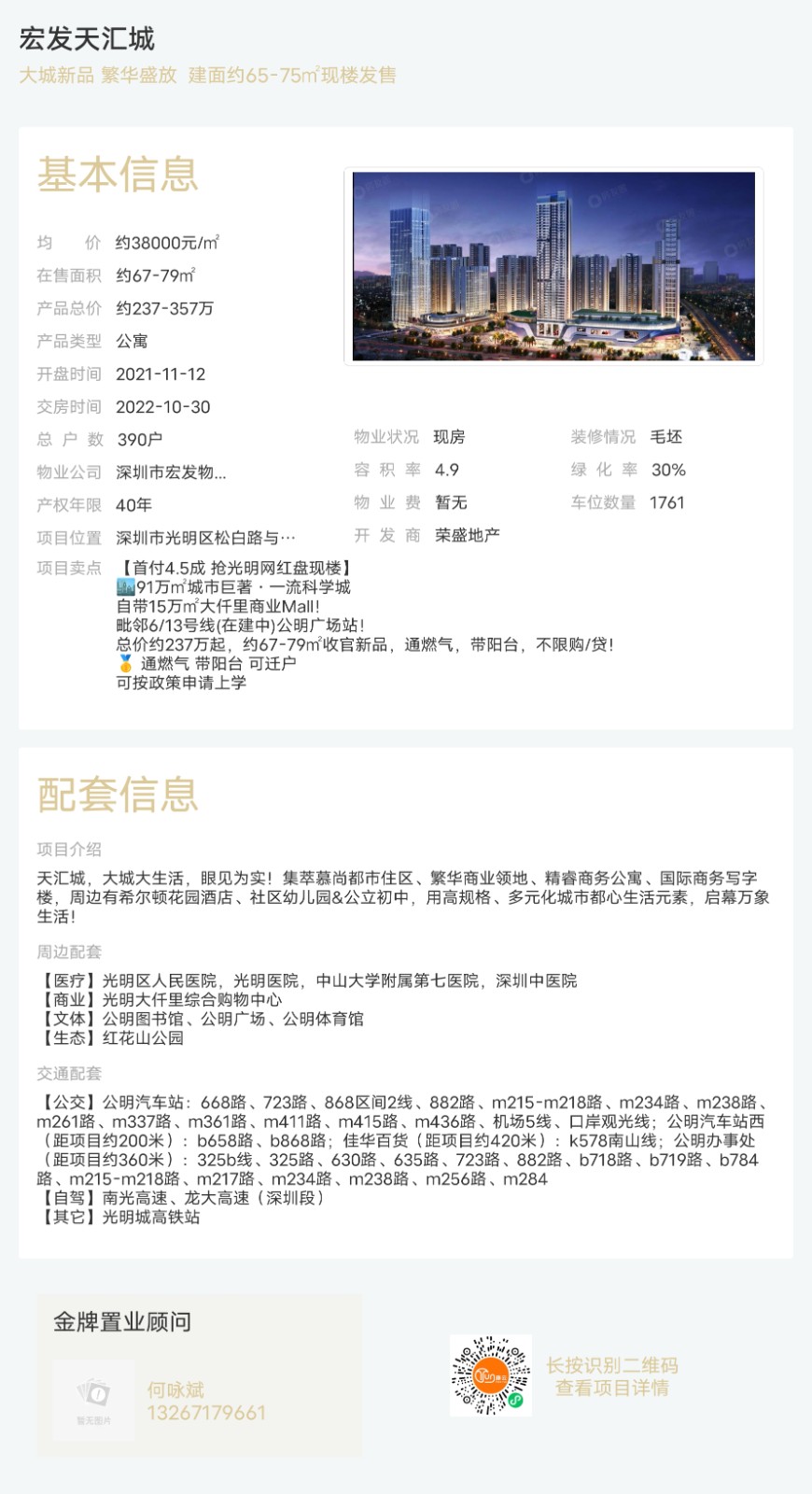樓盤:宏發天匯城物業類型:公寓戶型:2室、3室面積:約67-79平米總價:約237-357萬聯系人:何詠斌聯系電話:13267179661
